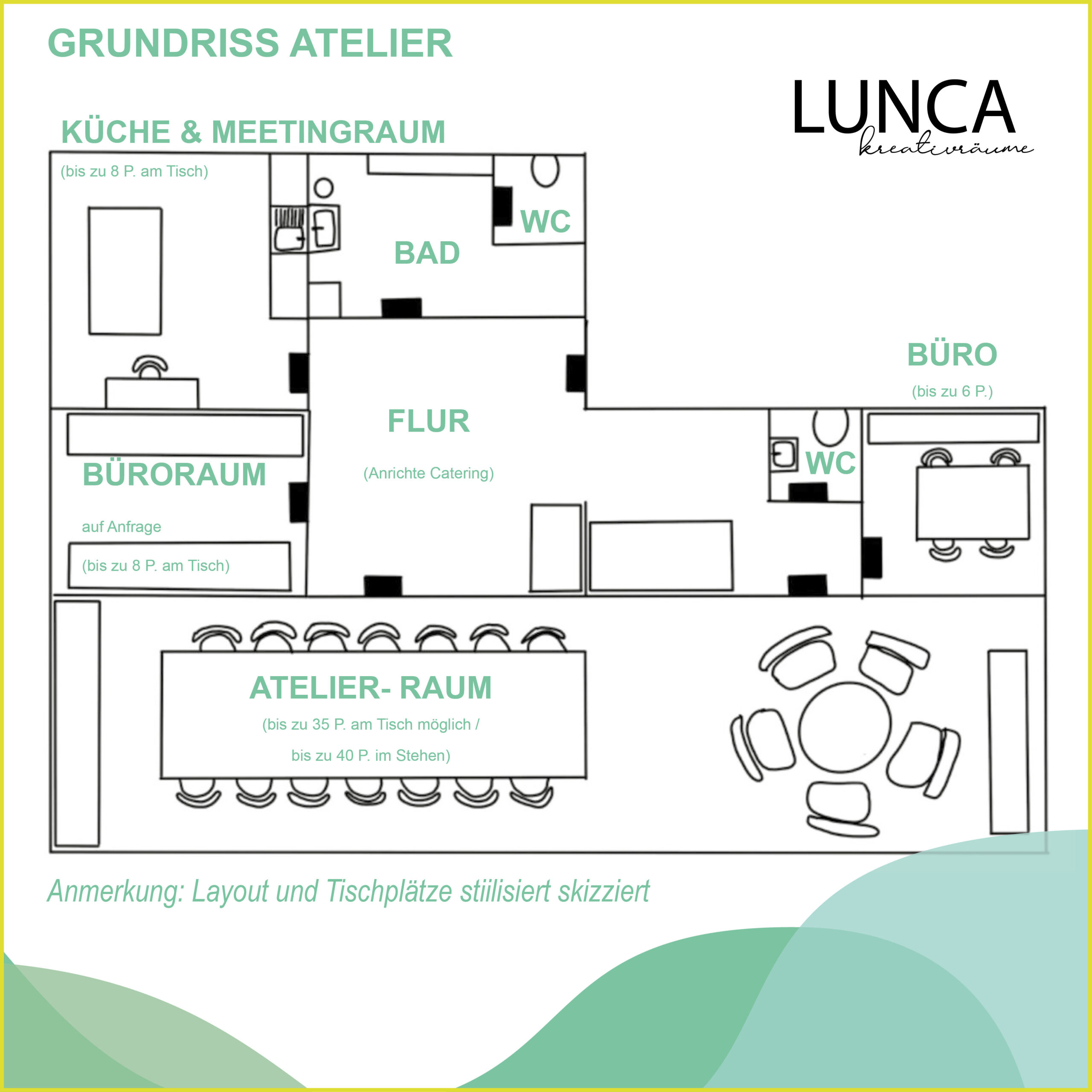 Raumaufteilung: 1. Stock, großer Atelierraum mit bis zu 35 Tischplätzen (40 Personen im Stehen/Sitzen ohne Tische möglich) + separater Meetingraum + Küche/Meetingraum mit bis zu 8 Tischplätzen