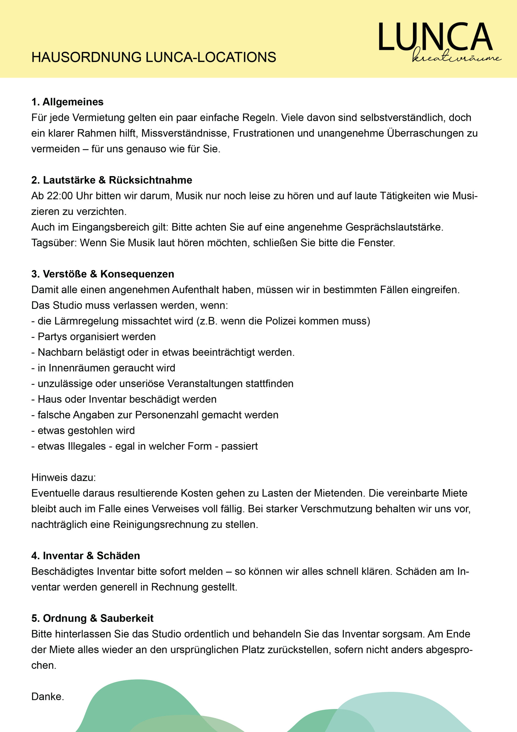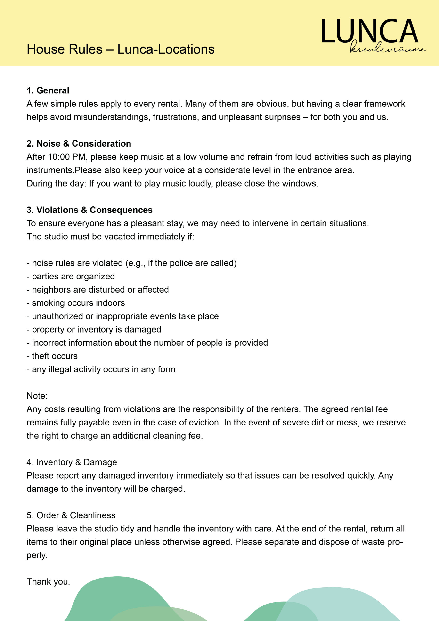 If you notice any damage or other irregularities, such as dirt or stains in our premises at the start of your rental, please send us photos immediately and contact us by phone. This ensures that we do not attribute the damage to you. If something gets damaged during your rental period, please also notify us immediately. In many cases, liability insurance may cover such incidents. In the case of negligent behavior, unreported damage, or failure to comply with our house rules, you may be asked to leave the studio. Any resulting costs will be invoiced.